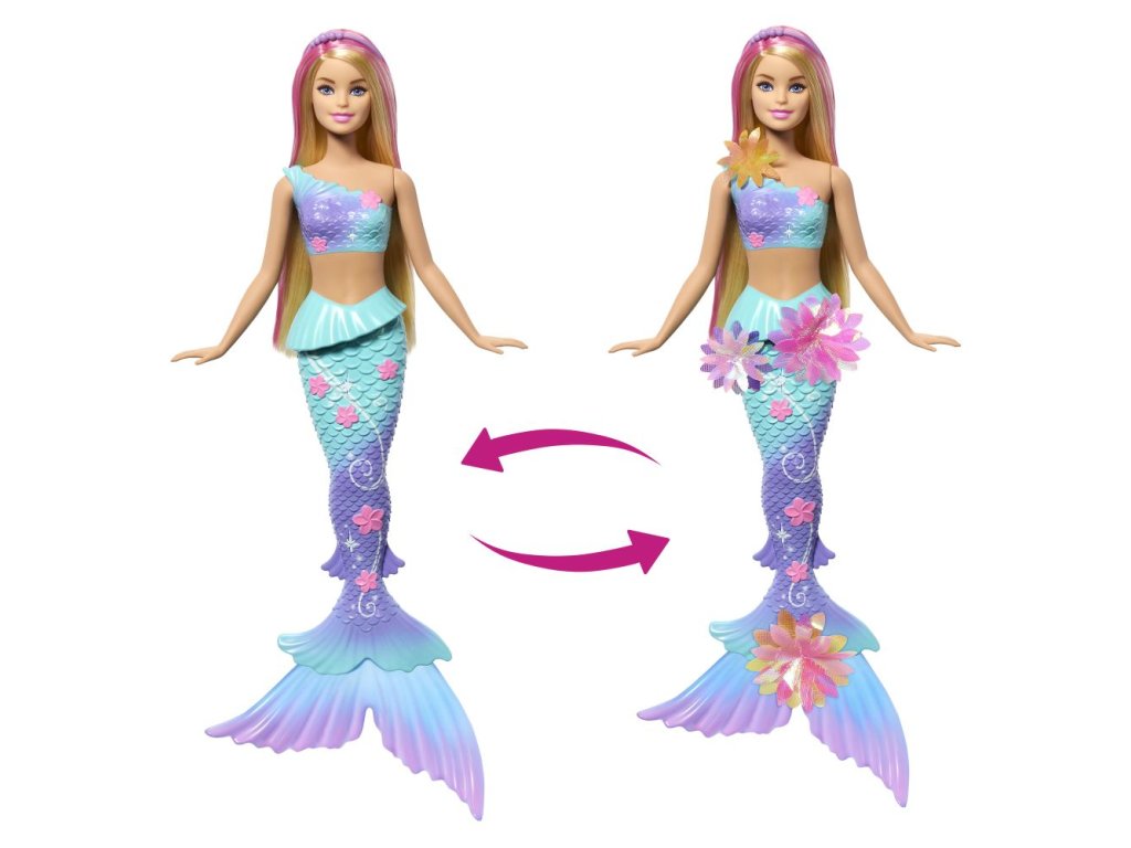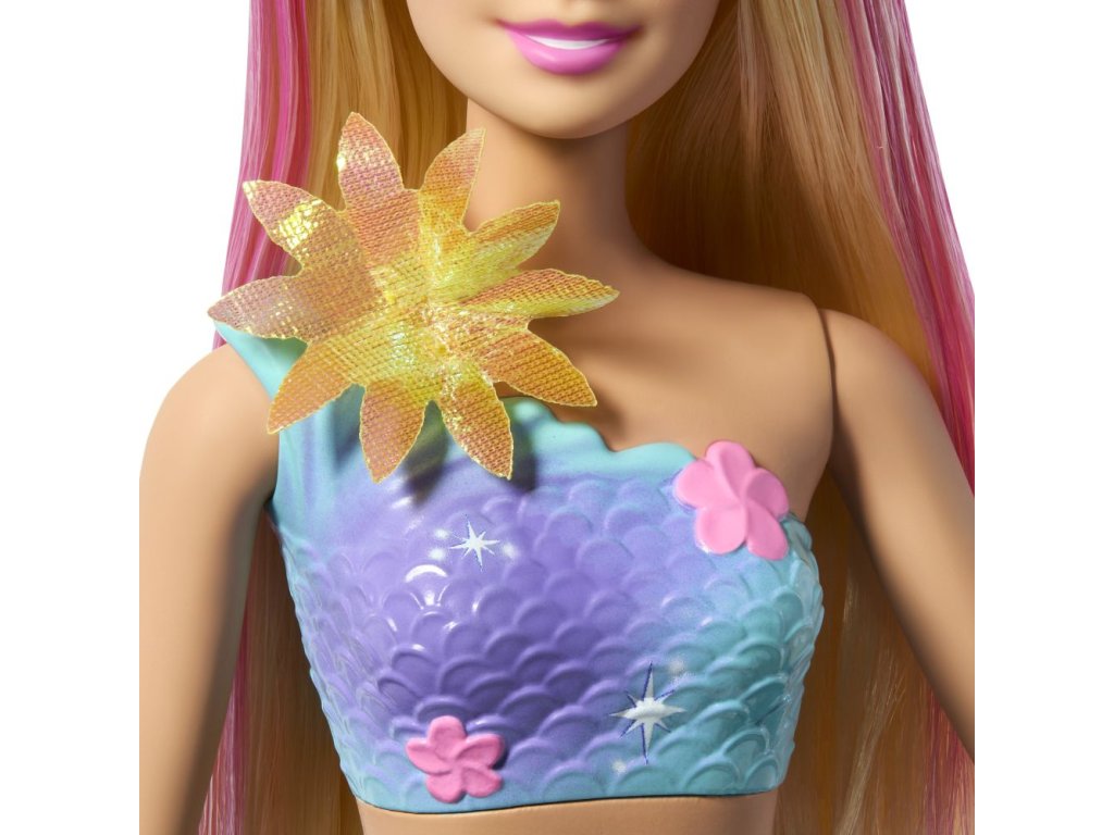 Zažijte zábavu s panenkou Barbie! Posunutím páčky na jejích zádech uvidíte, jak jí květiny kouzelně „rozkvétají“ od živůtku až po její ploutve, a to pořád dokola. Děti si s ní mohou hrát na souši i pod vodou, aby se jim na slunci nebo v moři naskytla nádherná přehlídka květů. S duhovými květy, ombré ploutvemi a doplňkem v podobě perlové čelenky v dlouhých blond vlasech s růžovým melírem - tato panenka Barbie mořská panna je naprosto okouzlující! Panenka nemůže stát ani plavat sama. Barvy a vzhled výrobku se mohou lišit.
