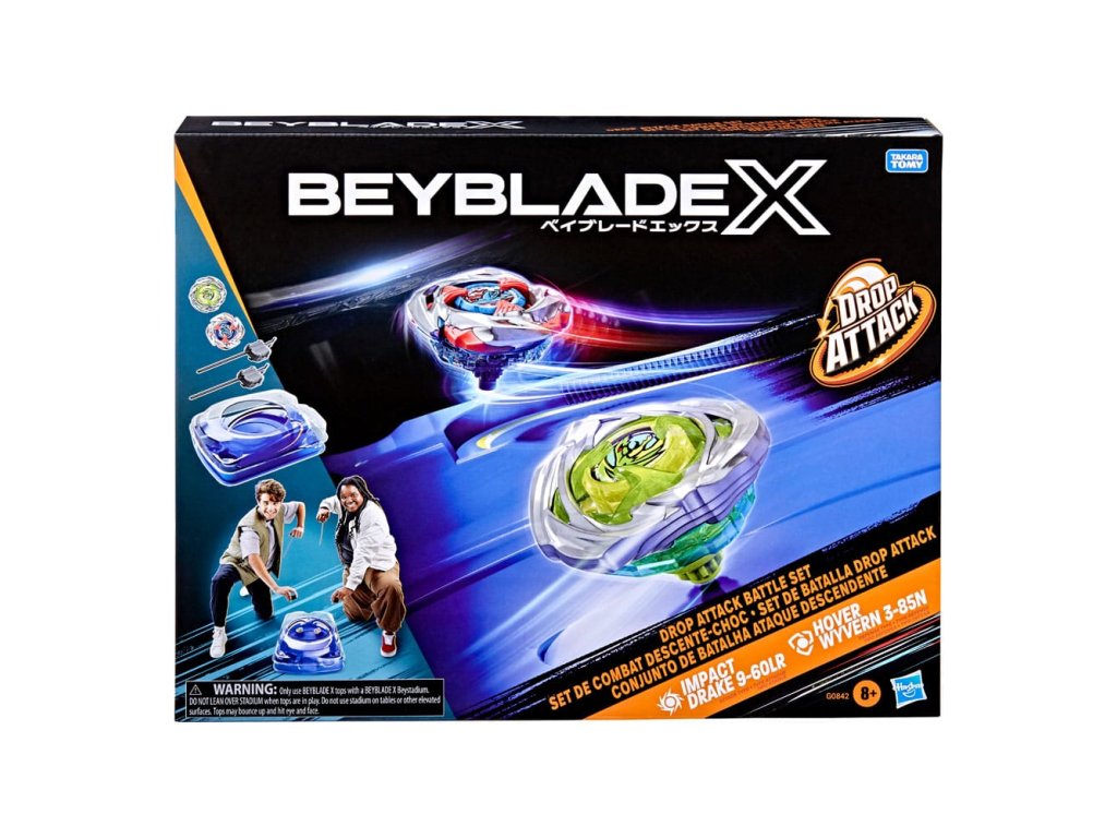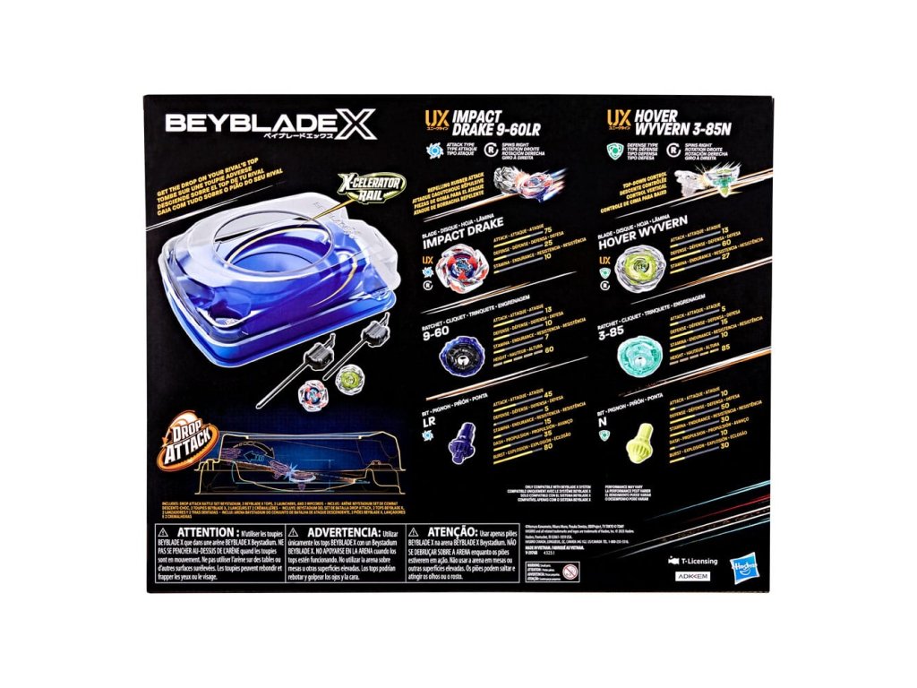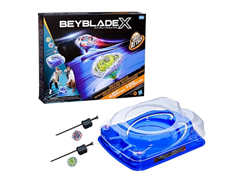 Souprava Beyblade X pro bitvu s překvapivým útokem obsahuje vše, co potřebujete k začátku bitvy - Beystadium, 2 vršky a 2 odpalovače! Dráha X-Celerator stadionu může vršky extrémně urychlit do Xtreme Dash po aréně pro drcení kolizí a epické výbuchy. A s Beystadium Drop Attack můžete překvapit vršek svého soupeře - zvýšená dráha X-Celerator stadionu může poslat vršky Beyblade do vyššího patra, odkud mohou spadnout na vršky svých soupeřů níže! Použijte 2 odpalovače k uvolnění vršku typu útoku Impact Drake 9-60LR a vršku typu obrany Hover Wyvern 3-85N v šílenství zuřivosti. Bladers vypustí svůj vrchek proti svému soupeři a sbírají body - první s 4 body vyhraje. Vyměňujte lopatku, trysku a bit s vrstvami jiných vrcholů X Beyblade (prodávají se samostatně) pro sestavení svého dokonalého vrcholu. Hračky Hasbro Beyblade s autentickými vršky z kovové odlitky Takara Tomy jsou skvělé dárky pro chlapce i dívky od 8 let.