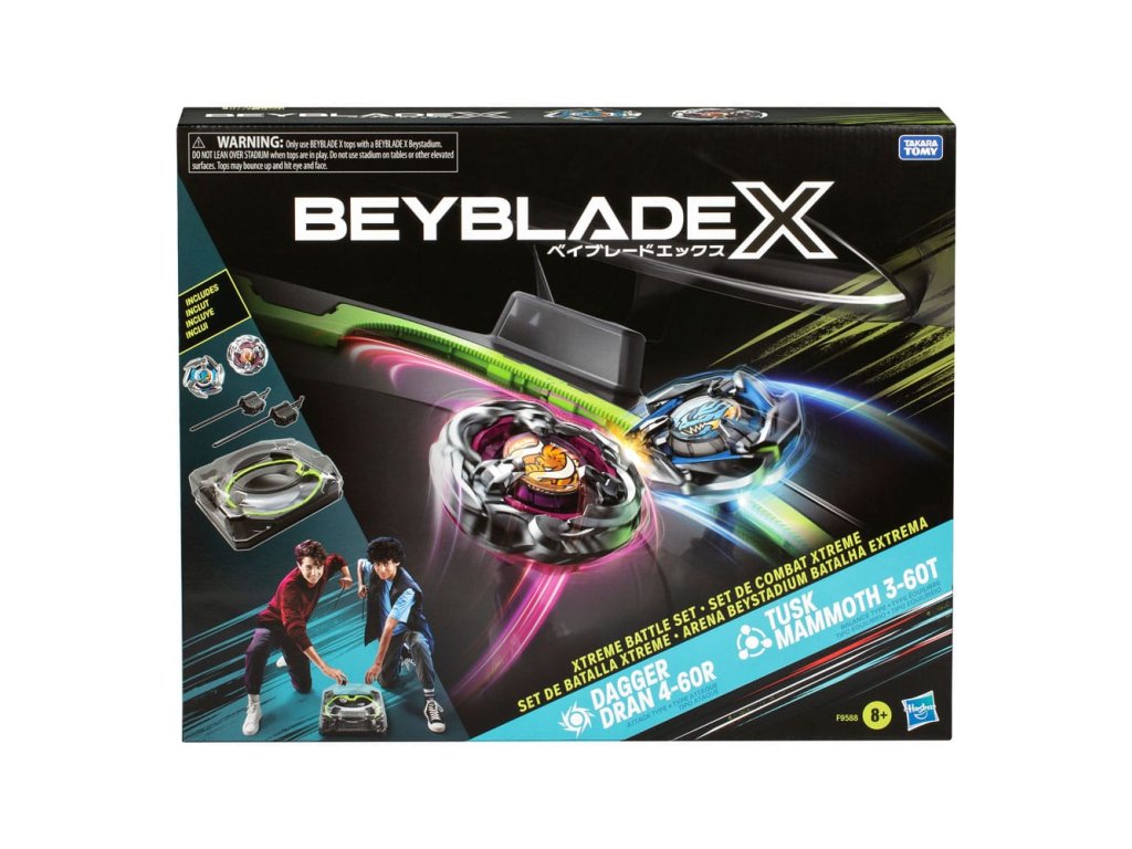 Zažijte vzrušení z další generace vrcholků Beyblade, Beyblade X. Souprava pro bitvu Beyblade X Xtreme obsahuje vše, co potřebujete k zahájení své cesty za Beymistrovstvím. Xtreme Bey-stadión (43,8 x 35,5 cm) a 2 vrcholky Beyblade X s pravotočivým otáčením jsou vybaveny systémem X-Celerator Gear, který vylepší vaši hru a prokáže to v bitvě! Když se zařízení vrcholu zapojí do kolejí X-Celerator Rail stadiónu, může se rychlou akcelerací změnit na Xtreme Dash a raketově ho roztočit po aréně pro destruktivní nárazy. Použijte 2 odpalovače k uvolnění vrcholků Dagger Dran 4-60R útočného typu a Tusk Mammoth 3-60T vyváženého typu. Bladers spustí svůj vrchol proti soupeřovu a dostávají body za každý střet – ten, kdo jako první dosáhne 4 body, vyhrává. Vyměňujte vyměnitelný čepel, ratchet a bit s vrstvami ostatních vrcholků Beyblade X (prodávají se zvlášť), abyste vytvořili svůj vlastní nepřekonatelný vrchol. Hračky Beyblade od firmy Hasbro jsou autentické tops od firmy Takara Tomy s díly z odlévaného kovu, které skvěle padnou jako dárek pro chlapce i dívky od 8+ let.