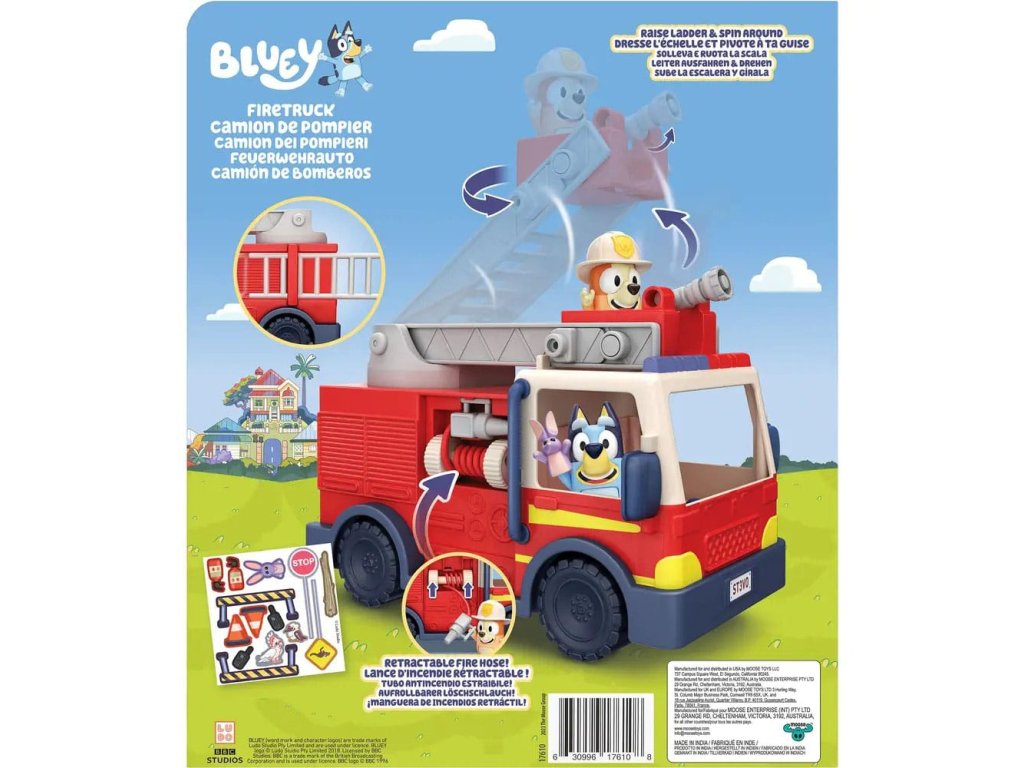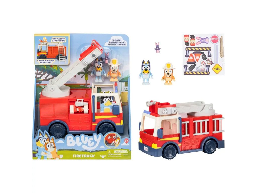 Sada zahrnuje oblíbené postavičky Bluey, Bingo jako statečného hasiče a Boba Bilbyho. Společně tvoří neporazitelný tým. Váš Bluey hasičský vůz je připraven na jakoukoli mimořádnou událost! Prodloužete žebřík, otáčejte ho o 360 stupňů a vyválejte hadici na hasení požárů pro ještě realističtější záchranné scénáře. Sada obsahuje: - 3 x figurky (Bluey, Bingo jako hasič, Bob Billy) - 1 x hasičské auto - 1 x list s nálepkami.