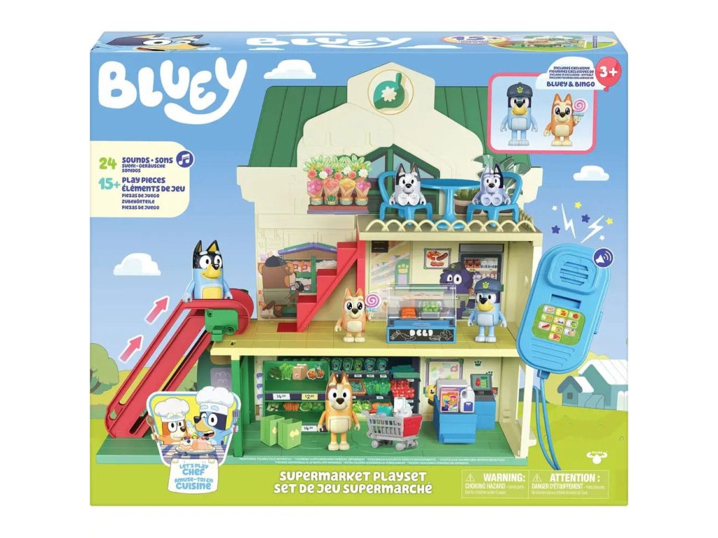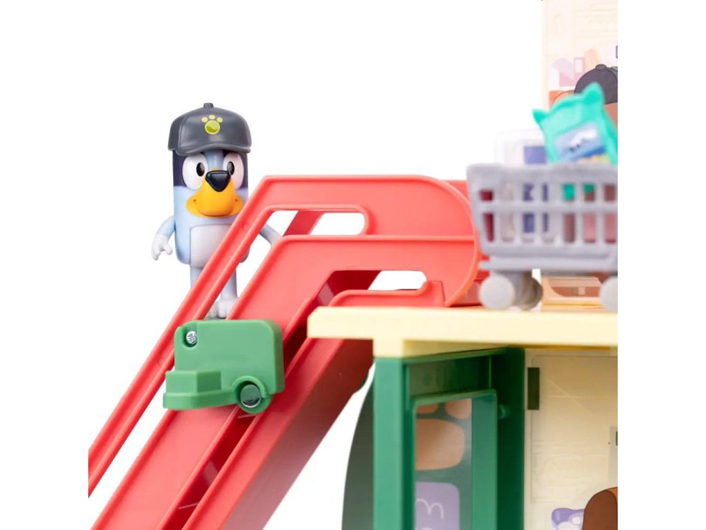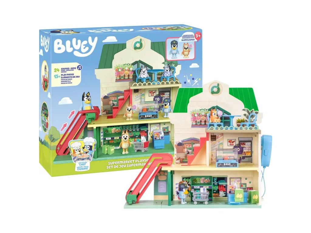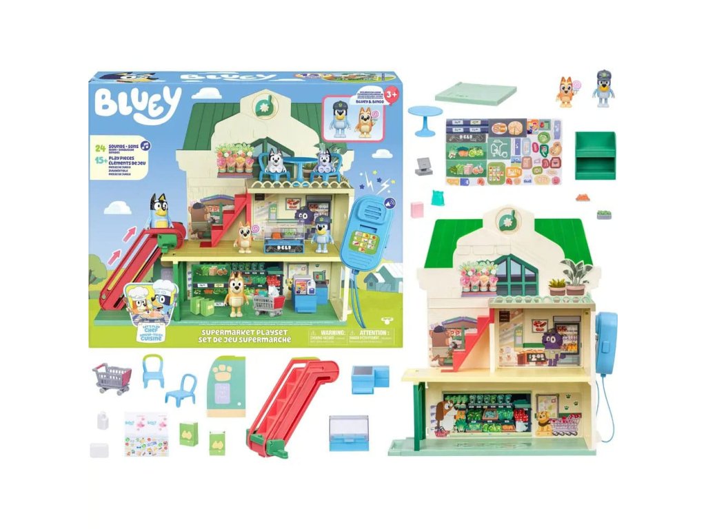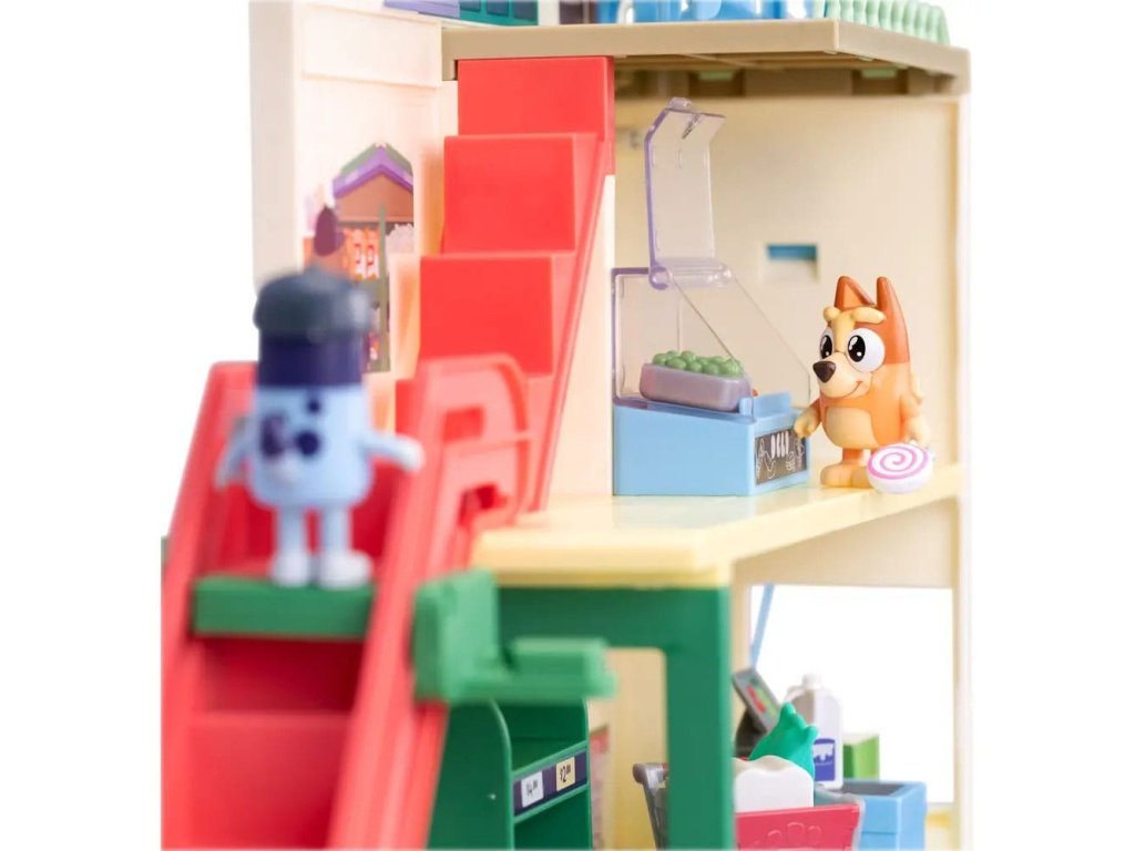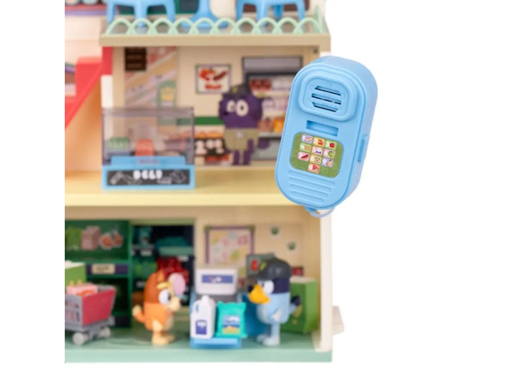 Připojte se k Bluey a Bingo na jejich nákupních výletech trojpodlažním supermarketem a poté si vychutnejte vynikající pokrm v restauraci v nejvyšším patře. Sada obsahuje: - Tři patra - 2 x Hrací figurky (Bluey, Bingo) - 13 x Zařízení (nábytek, samolepky, nákupní vozíky a mnoho dalšího) - 1 x Pohyblivé schodiště - 1 x Funkční mikrofon Informace o bateriích: 3 x AAA (nejsou součástí balení).