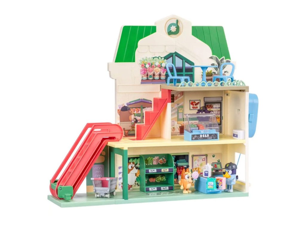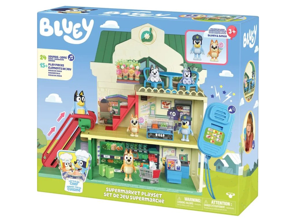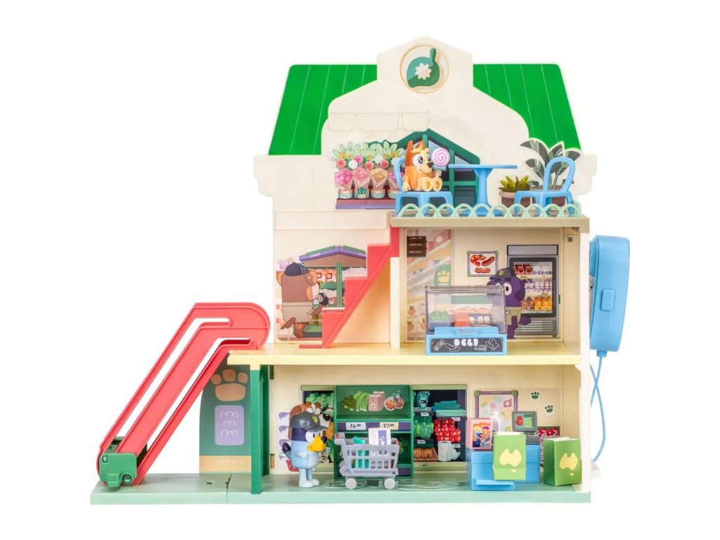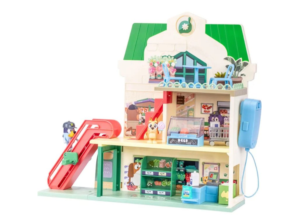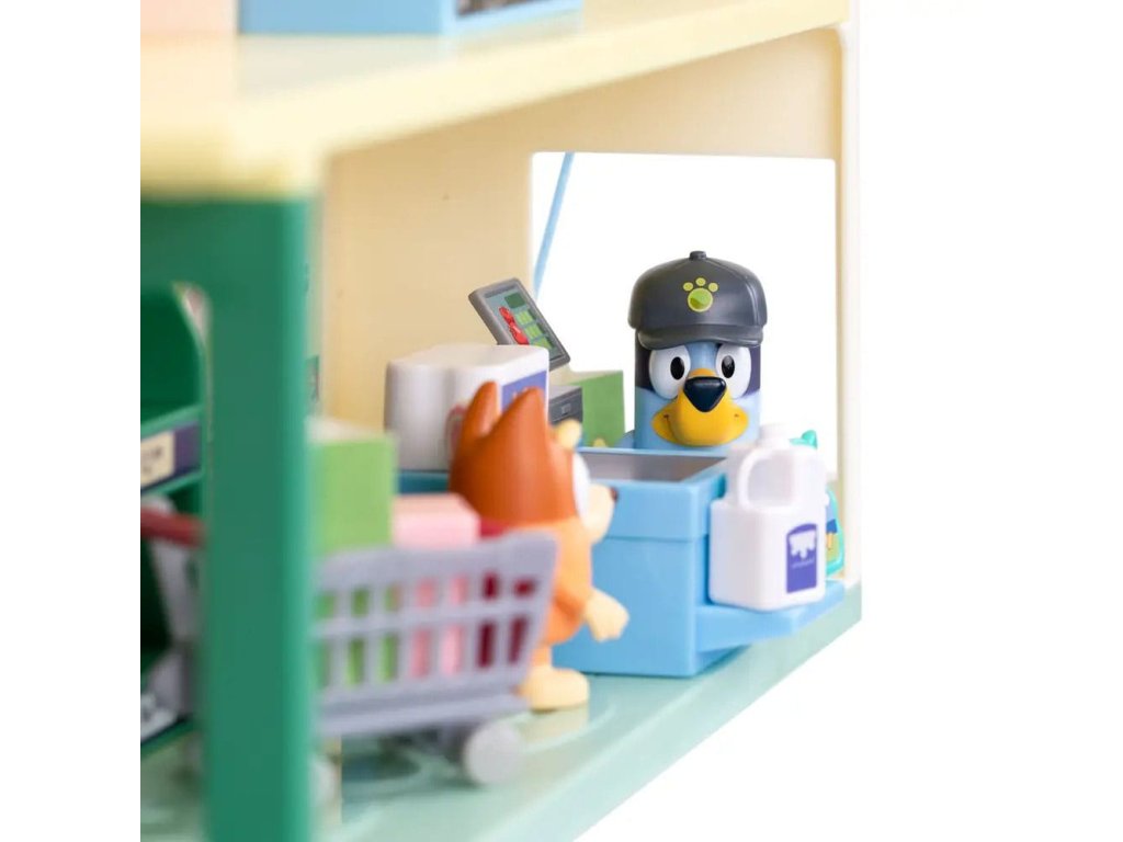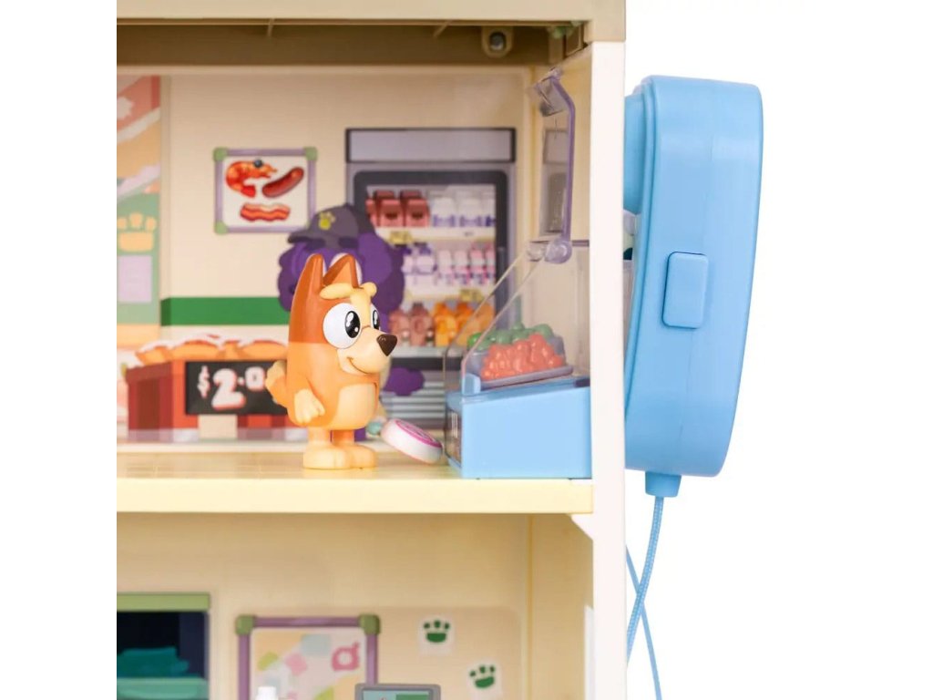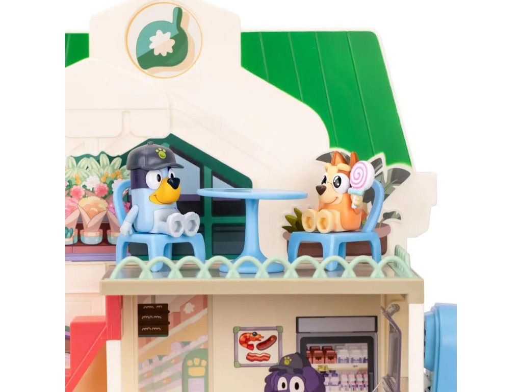 Připojte se k Bluey a Bingo na jejich nákupních výletech trojpodlažním supermarketem a poté si vychutnejte vynikající pokrm v restauraci v nejvyšším patře. Sada obsahuje: - Tři patra - 2 x Hrací figurky (Bluey, Bingo) - 13 x Zařízení (nábytek, samolepky, nákupní vozíky a mnoho dalšího) - 1 x Pohyblivé schodiště - 1 x Funkční mikrofon Informace o bateriích: 3 x AAA (nejsou součástí balení).