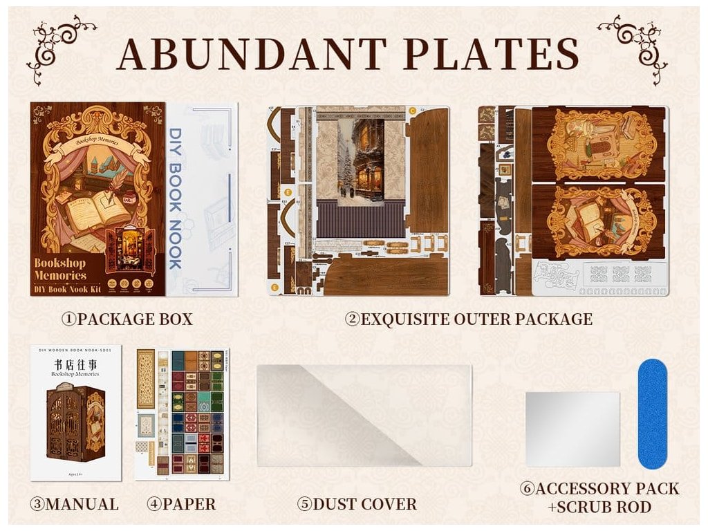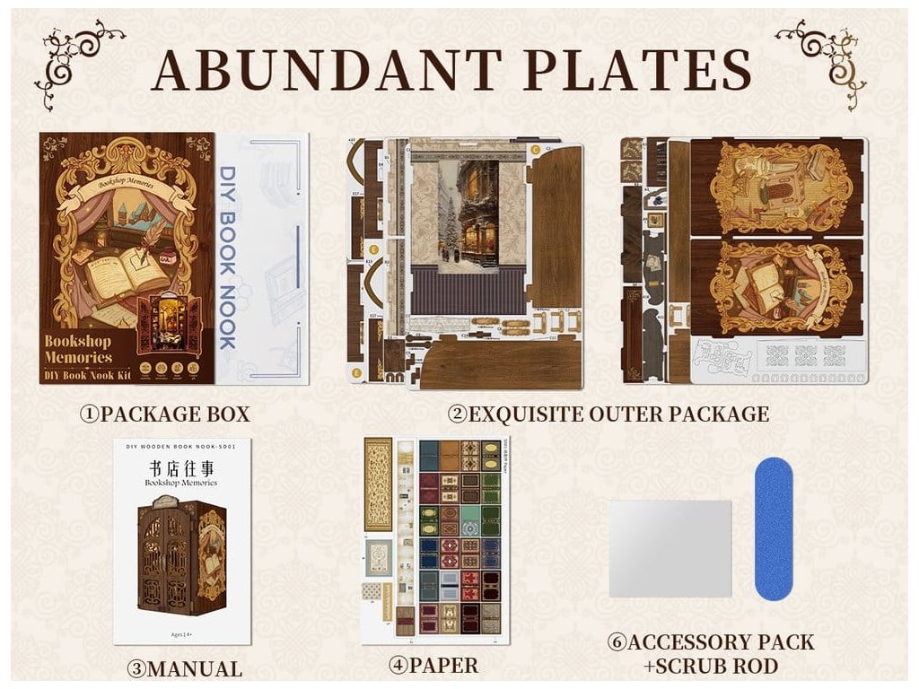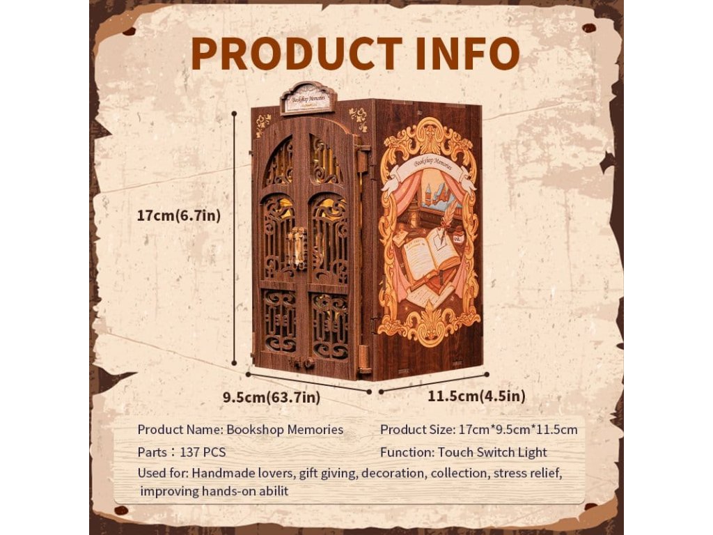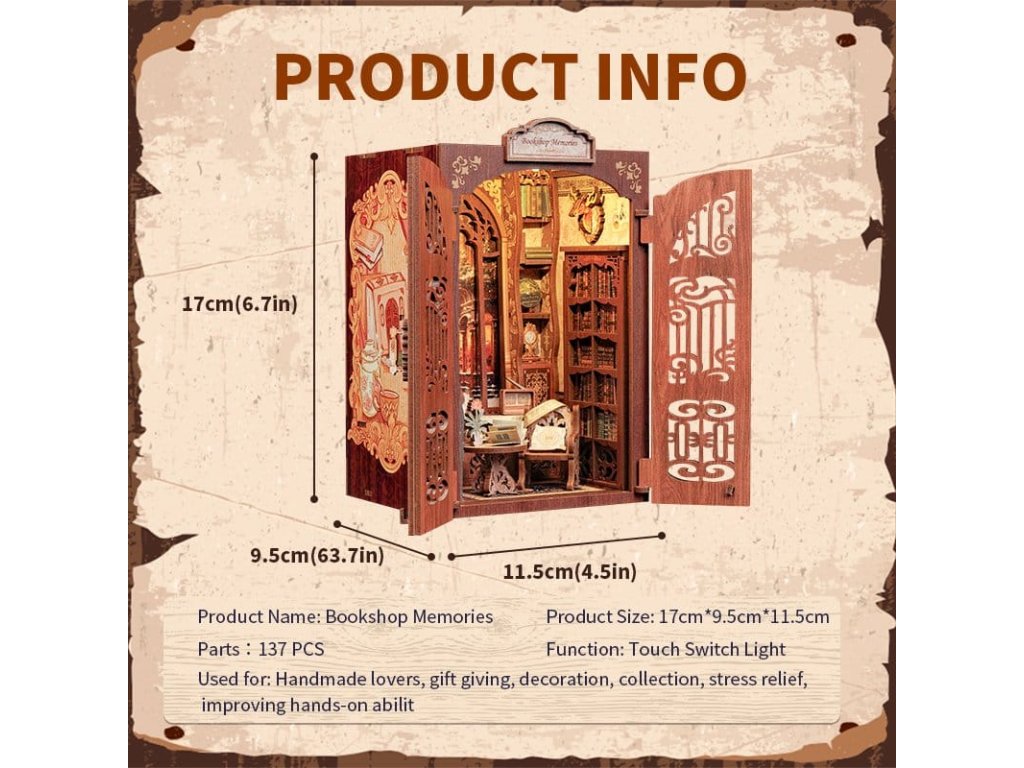 Tvořivá úniková hra mezi vašimi knihami - CuteBee Book NooksCuteBee Book Nooks je více než dekorativní police - jsou to pohlcující tvořivé zážitky pro děti, rodiny a dospěláky, doporučené pro věk 12 a více let. Navržené jako detailní 3D dřevěné puzzle, nabízejí klidný, soustředěný stavební proces, který povzbuzuje k bezobrazovkovému, stresu snižujícímu času pro sebe.Každý model sleduje jasnou a logickou strukturu s lehkým pochopením pokynů, vytváří rychlé úspěšné okamžiky po celou dobu stavby. Rovnováha mezi angažující montáží a krásným konečným výsledkem přináší hluboký pocit uspokojení a relaxace. Perfektní pro fanoušky LEGO, stavebních bloků, měřítkových modelů a japonských modelových sad.Dřevěné části vyřezávané laserem poskytují prémiový pocit s přesnými spoji, čistými hranami a kvalitním povrchovým úpravami. Díky systému Easy-Snap lze většinu prvků sestavit s minimálním lepidlem, což činí proces přívětivým pro začátečníky, čistým a reverzibilním.Rozsáhlý výběr témat včetně fantasy, středověkých světů, magie, asijsky inspirovaných scén a útulných prostředí, CuteBee Book Nooks nabízejí silnou sběratelskou a přeprodejní hodnotu - zřejmě ne jde o jednorázovou nákupní položku.Poznámka: Baterie a dřevěné lepidlo nejsou součástí balení.