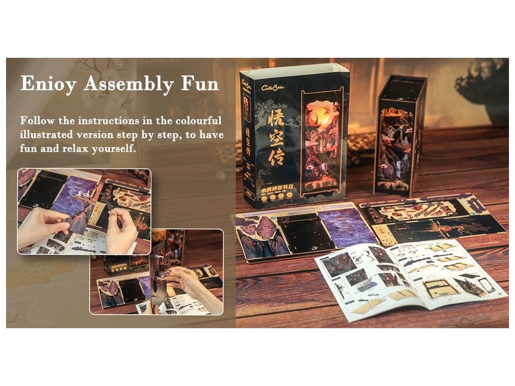 Tvořivý únik mezi vašimi knihami - Knižní Koutky CuteBee. Knižní koutky CuteBee nejsou jen dekorativními policemi - jsou to pohlcující tvořivé zážitky pro děti, rodiny a dospělé s dětskou duší, doporučené pro věk 12 a více let. Navrženy jako detailní 3D dřevěné puzzle nabízejí klidný, soustředěný stavební proces, který povzbuzuje k období bez stresu a bez obrazovek. Každý model sleduje jasnou a logickou strukturu s snadno pochopitelnými pokyny, které vytvářejí momenty úspěchu během stavění. Vyváženost mezi zapojením do stavby a krásným konečným výsledkem přináší hluboký pocit uspokojení a relaxace. Ideální pro fanoušky LEGO, stavebnic, modelů a japonských stavebnic. Laserem řezané dřevěné díly poskytují prémiový pocit s přesnými spoji, čistými hranami a vysoce kvalitním povrchem. Díky systému Easy-Snap lze většinu prvků sestavit s minimem lepidla, což činí proces přívětivým pro začátečníky, čistým a reverzibilním. S širokou škálou témat včetně fantasy, středověkých světů, magie, scén inspirovaných Asií a útulných prostředí, nabízí Knižní koutky CuteBee silnou sběratelskou a přeprodejovou hodnotu - rozhodně nejde o jednorázovou položku k nákupu. Poznámka: Baterie a dřevěné lepidlo nejsou součástí balení.