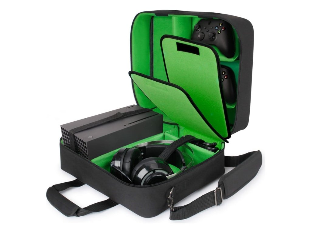 Cestovní pouzdro USA Gear S23 nabízí přizpůsobitelnou a bezkonkurenční ochranu pro vaši herní konzoli Xbox a příslušenství. - Polstrovaný, odolný proti poškrábání interiér s dvoukřídlým designem - Přizpůsobitelné přihrádky pro sluchátka, kabely, hry a ovladače - Dva bezpečnostní popruhy pro uchycení konzole na místě - Odolný, voděodolný nylonový exterier RipStop - Těžká nesací rukojeť a odnímatelný ramenní popruh - Vnější rozměry: 16,5 x 14 x 6,5 palců - Vnitřní rozměry: 15,5 x 12,5 x 6 palců.