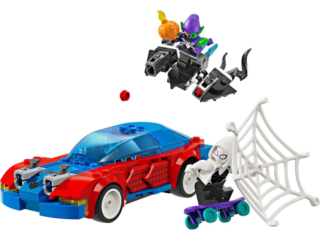 Spider-Man, Ghost-Spider a Venom Zelený goblin se utkají v rychlé akční bitvě s řadou vozidel, zbraní a doplňků. Spider-Manovo auto má 2 přední vystřelovače, Zelený goblin se pyšní 2 vystřelovači na kluzáku a dýňovými bombami a Ghost-Spider při jízdě na skateboardu používá 2 ruční vystřelovače pavučin. Spider-Man se houpe na ohebném pavučinovém „laně“ a pomocí velké pavučiny uvězní padouchy. Odnímatelné části stavebnice umožňují přístup do interiéru auta, do kterého se vejdou hned 2 minifigurky a skateboard. Pro ještě více digitální zábavy je zde zábavná a intuitivní aplikace LEGO Builder, kde mohou stavitelé přibližovat a otáčet modely ve 3D a sledovat postup.
