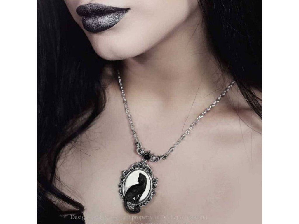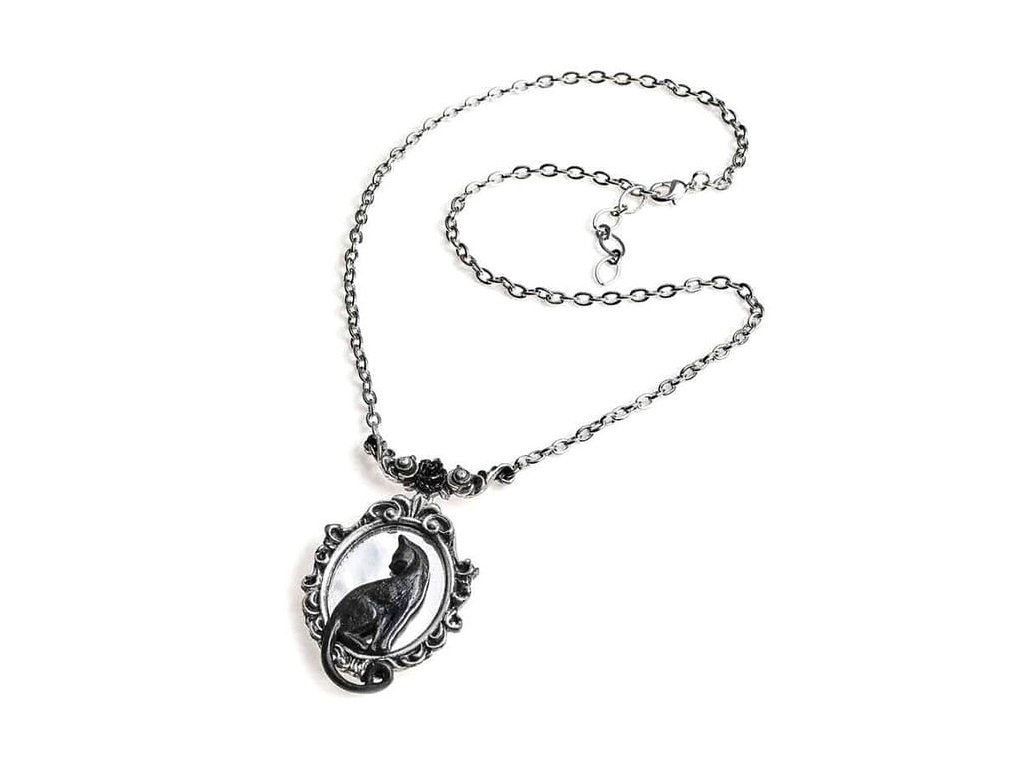 Elegantní kočičí náhrdelník se zrcátkem, tichý, nenápadný a všudypřítomný společník. Přívěsek zpodobňuje kočku, která se dívá do zrcadla se zdobeným rámem, náhrdelník je opatřen zdobeným řetízkem délky 48 cm. Dodejte svému oděvu eleganci s tímto přívěskem „Purrrrfect“.orginální šperk od Alchemy Gothic