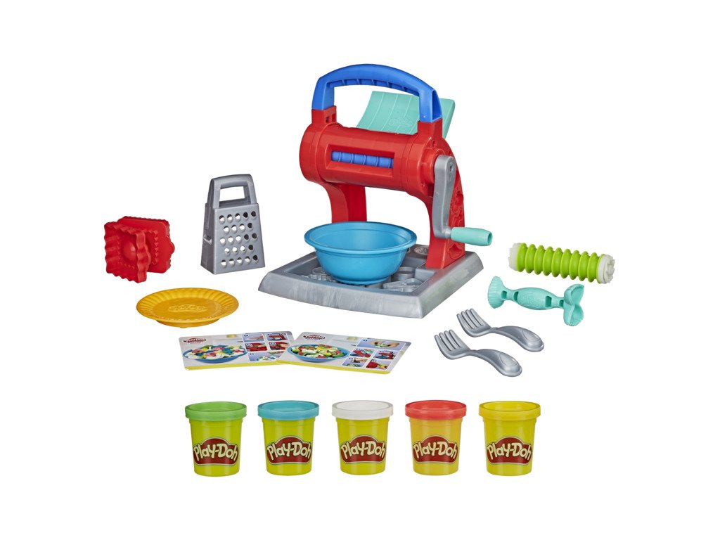 Udělejte si moře těstovin s tímto strojkem na jejich výrobu Play-Doh inspirovaným skutečným strojkem na těstoviny! Nový klikový mechanismus vše usnadňuje a je zábavnější než kdykoli předtím. Umožňuje vytvářet úžasné nudle. Vyměnitelné válečky uvnitř vytvářejí buď rovné špagety nebo vlnité vaječné nudle. Existují také formičky pro výrobu raviol, těstovinových mašliček a dalších menších tvarů těstovin. Nezapomeňte nahoru nastrouhat sýr Play-Doh a dokončit perfektní těstovinové jídlo!