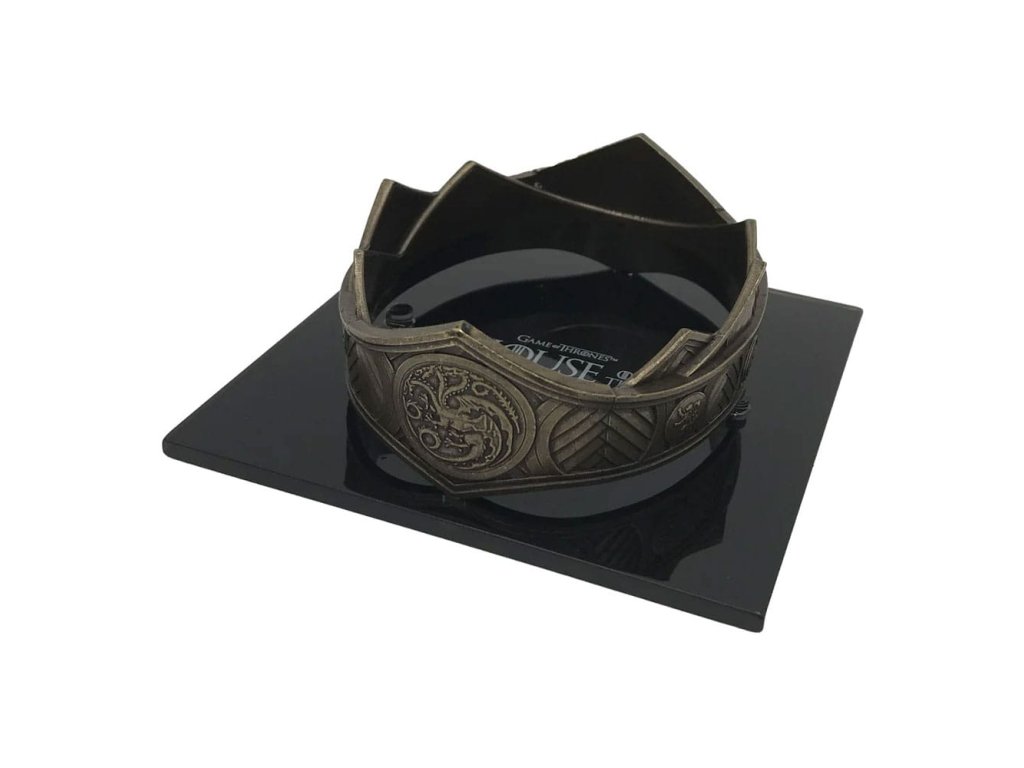 "Koruna nemůže stát pevně, pokud dům draka zůstává rozdělený." -Král Viserys Targaryen Jak ji výrazně nosili Král Viserys Targaryen a Rhaenyra Targaryen v populárním seriálu HBO Dům Draka, tato nejnovější položka v řadě replik Factory Entertainment se vyznačuje jemnými detaily z originální rekvizity. Je odlita z pevného kovu, má hloubku 3,75 palce a šířku 3 palce a je dodávána s akrylovým displejem v sběratelském balení.