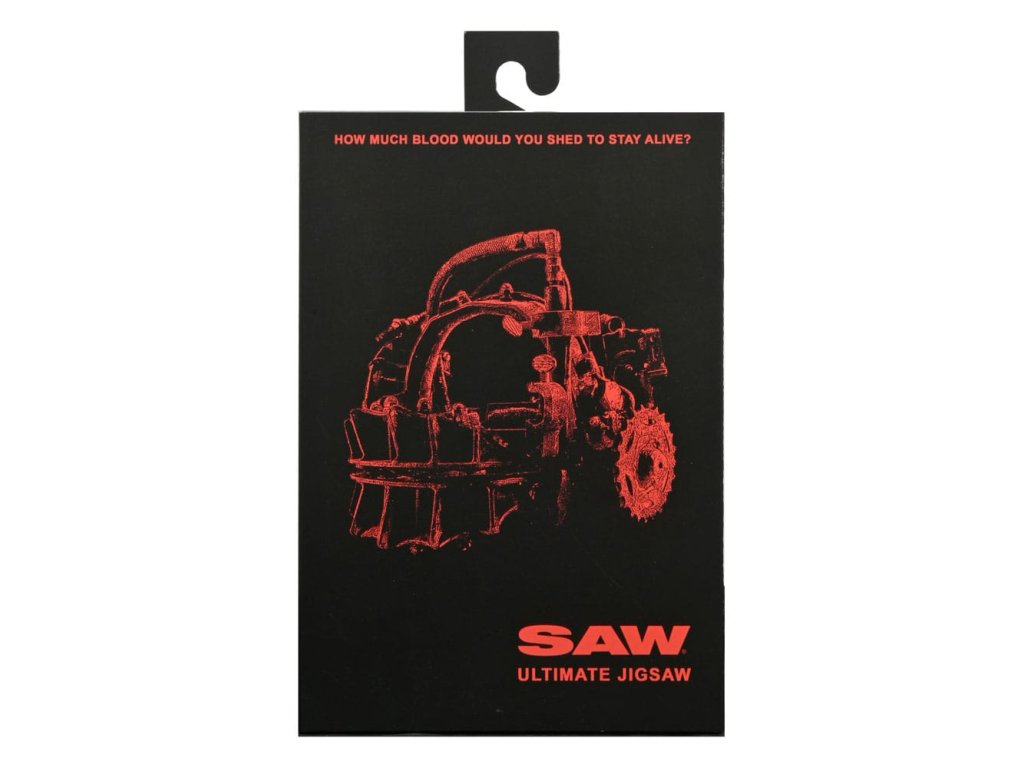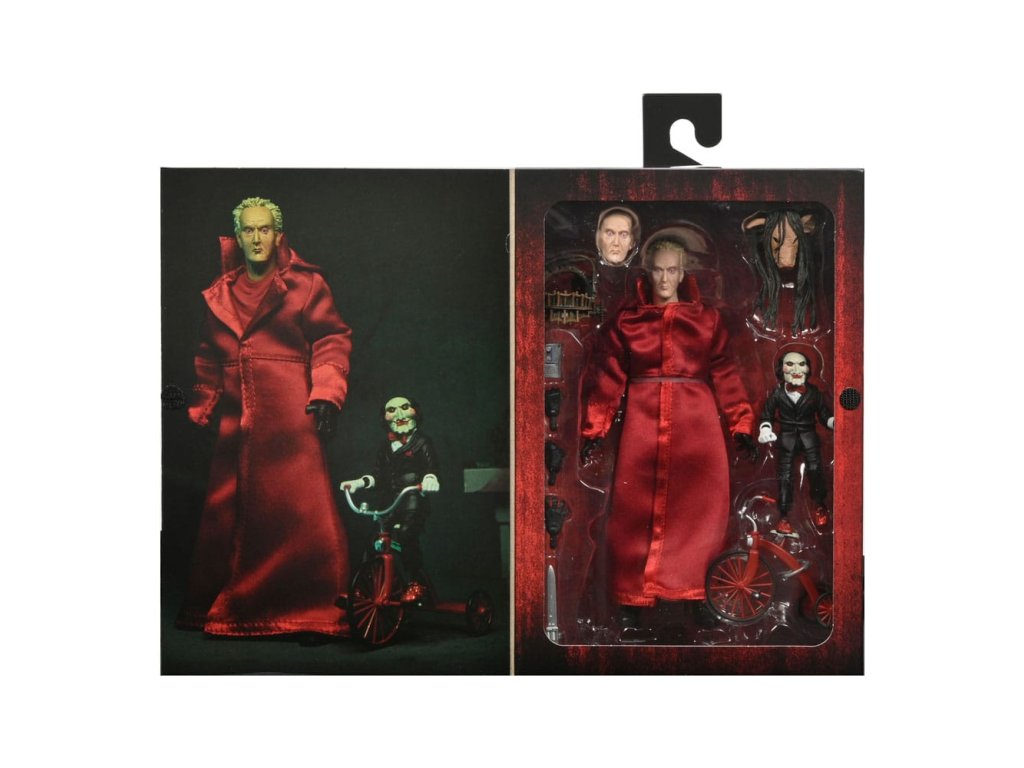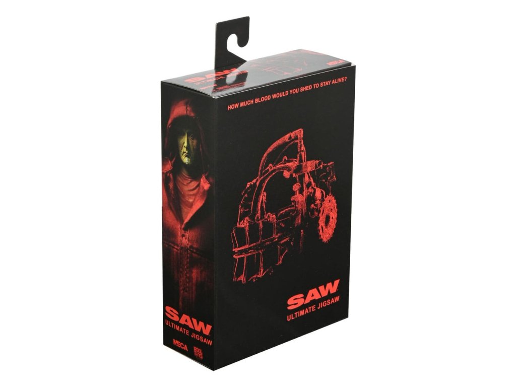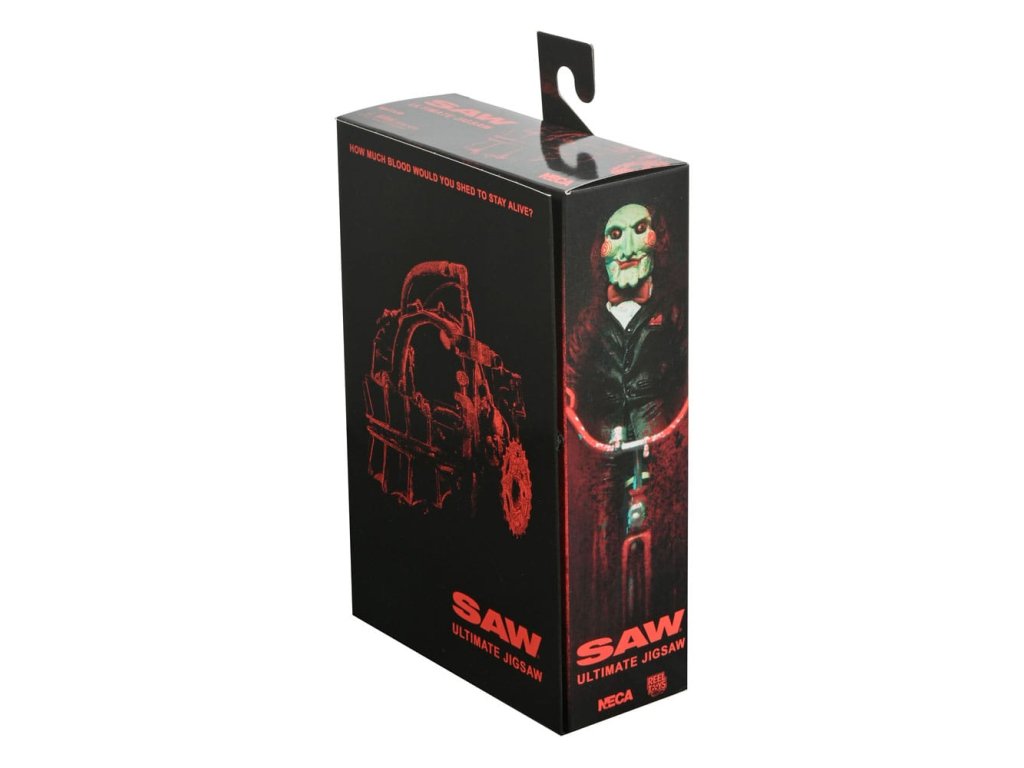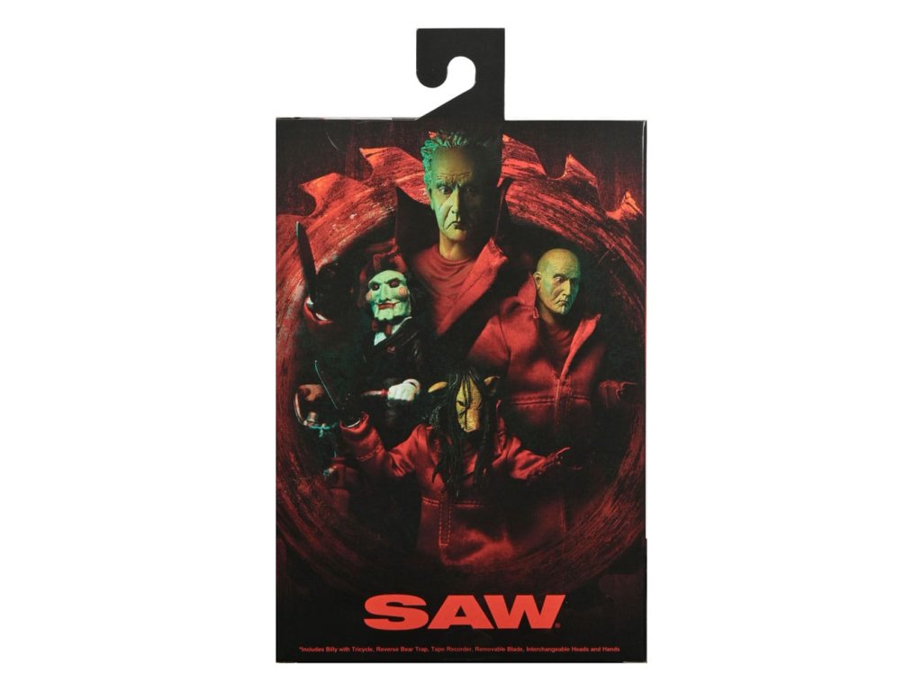 Ve filmech Saw unesl Zabiják Jigsaw v nespravedlivých pokusích naučit své oběti hodnotě života. Jakmile jsou jeho zajatci chyceni, musí čelit nemožným volbám v hrůzné hře o přežití, když s nimi komunikuje pomocí strašidelné loutky. Tato 7palcová figurka z filmu Saw v červeném plášti dostává ultimátní zpracování s plně artikulovaným tělem pod drátěným látkovým pláštem. Příslušenství zahrnuje: vyměnitelné hlavy a ruce, hlavu s prasečí maskou, hlavovou past na hádanky, magnetofon, rozšířenou čepel a Billyho loutku na tříkolce. Sběratelsky přívětivé obalové okno s otevíratelnou přední klapkou.