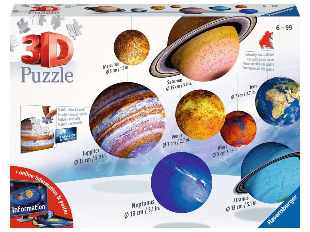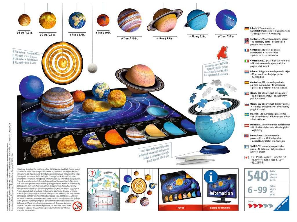 S touto sadou 8 různých 3D puzzle si můžete postavit a vytvořit sluneční soustavu v miniaturním provedení. 3D puzzle jsou zmenšeny tak, aby představovaly různé velikosti planet, takže Saturn a Jupiter jsou zastoupeny jako 108dílné puzzle, Uran a Neptun jako 72dílné puzzle, Země a Venuše jako 54dílné puzzle a Mars a Merkur jako 27dílné puzzle, celkem 522 dílků. Každé puzzle má zakřivené, vysoce kvalitní plastové dílky, které jsou na vnitřní straně očíslovány pro snadné sestavení. Každá "planeta" je dodávána s vlastním stojánkem a celá sada může být buď umístěna na barevném plakátu "Sluneční soustava (který obsahuje fakta o každé z planet), nebo může být zavěšena na niti. Součástí sady také papírové slunce a informační leták plný faktů pro všechny začínající astronomy!