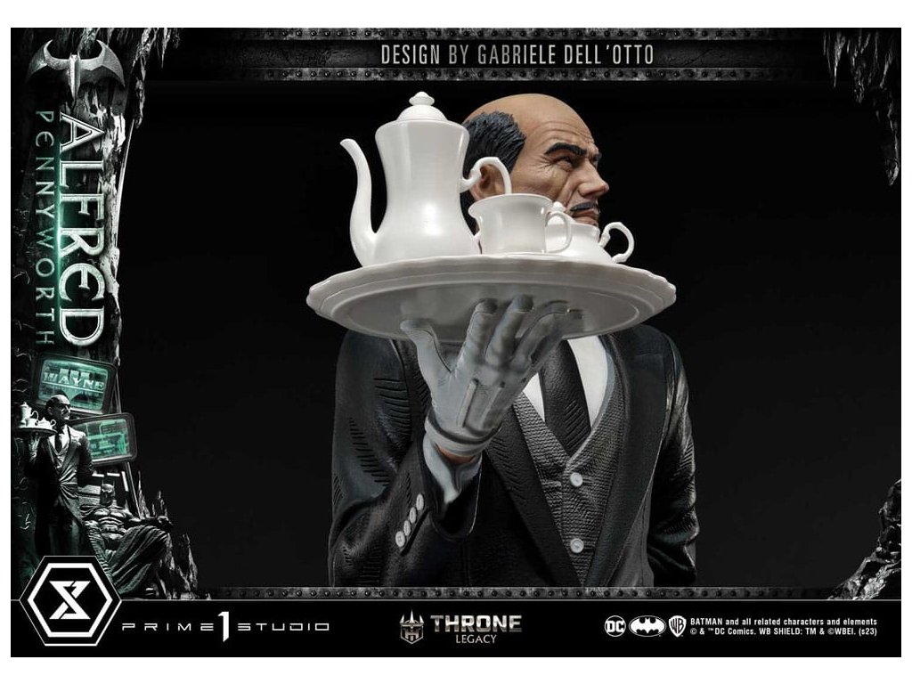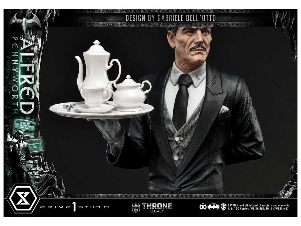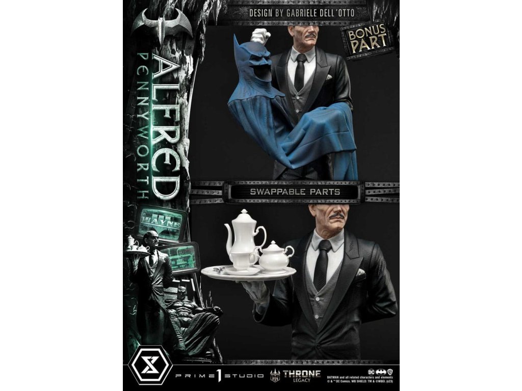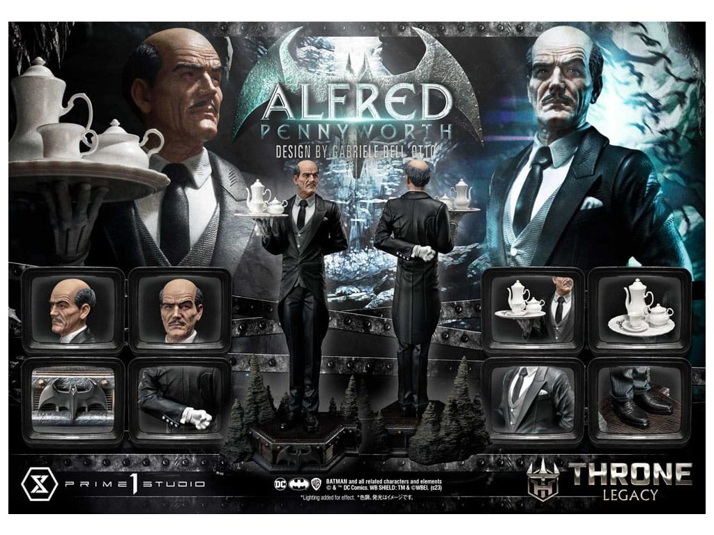 "Tak se probuď, můj chlapče; řekni tomuto městu, kým jsi." Prime 1 Studio s hrdostí představuje TLCDC-02 Alfred Pennyworth, Batovy důvěryhodný komorník ze série Throne Legacy. Poprvé vůbec se naši umělci dali dohromady, aby vytvořili tuto nádhernou sochu věrného komorníka a důvěrníka postavy Batmana. Tato socha může být doplňkem k Batman Tactical Throne, navrženému Gabrielem Dell'Ott, ale stejně tak by mohla být samostatnou součástí vaší nádherné sbírky superhrdinů DC Comics. Alfred je známý a oblíbený pro svůj bystrý intelekt, bezvadné chování a suchý humor. Asistuje Bruce Wayneovi jako jeho komorník a někteří ho považují za otcovskou postavu. Stará se o potřeby Wayne Manor a hraje klíčovou roli v Batmanově zločince bojující proti nabízení moudrosti a vedení. Alfred je vysoký 22 palců, oblečený do svého nejlepšího pruhovaného černého obleku, čisté černé kravaty pod šedou vestou. Perfektní, elegantní a klasický outfit pro nejlepšího komorníka. Drží čajový servis, zatímco levá ruka odpočívá za jeho zády. A když si objednáte bonusovou verzi z našeho oficiálního obchodu nebo u jakéhokoli autorizovaného distributora, obdržíte vyměnitelný pár rukou držících Batmanovu kuklu a plášť. Alfred Pennyworth je nenahraditelný jak pro Bruce Wayne, tak pro Batcave. Komorník přináší Batmanovu sérii teplý humor a neochvějnou loajalitu, což mu vysloužilo zvláštní místo v srdcích mnoha fanoušků. Ať už chcete tuto úchvatnou sochu zobrazit vedle Batman Tactical Throne nebo jako samostatnou položku - tato položka je nezbytná pro fanoušky Batmana a DC! Předobjednejte si dnes TLCDC-02 Alfred Pennyworth! Specifikace:- Velikost sochy Přibližně 22 palců [V: 57W: 29cm D: 26cm] - Základna ve stylu Batcave - Jeden (1) vyměnitelný bonusový pár rukou držící Batmanovu Kuklu & Plášť [BONUSOVÁ ČÁST]
