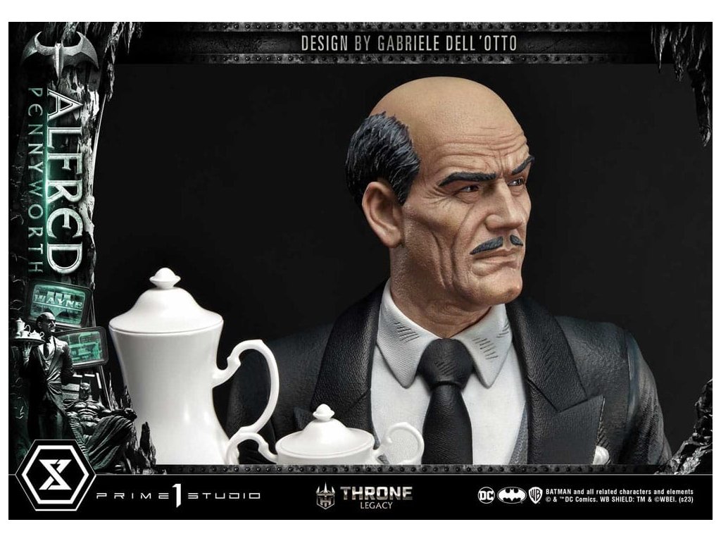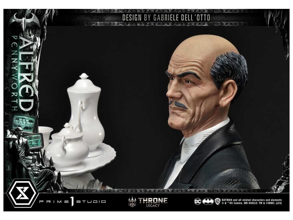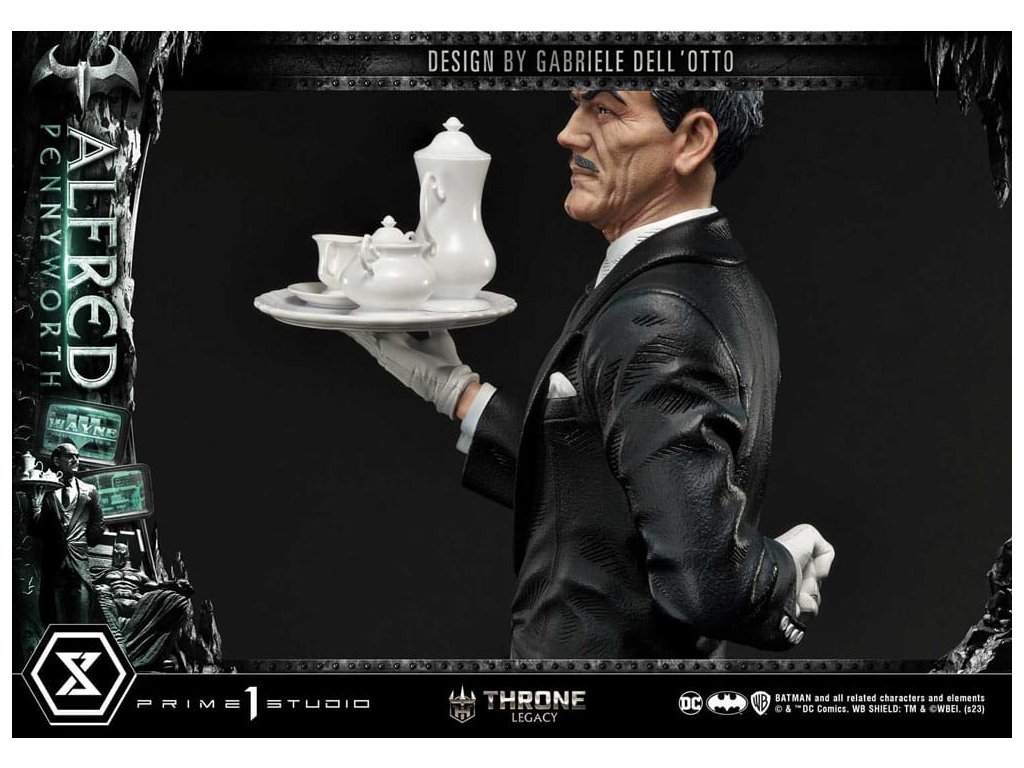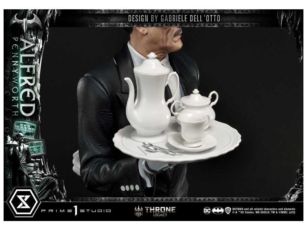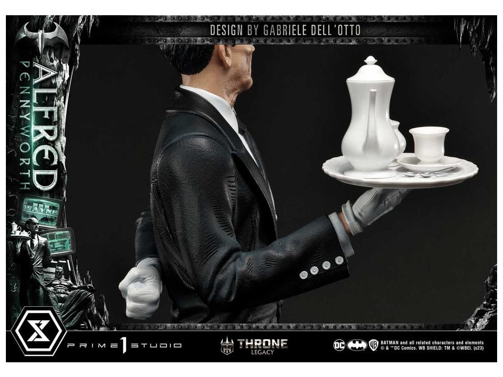 "Tak se probuď, můj chlapče; řekni tomuto městu, kým jsi." Prime 1 Studio s hrdostí představuje TLCDC-02 Alfred Pennyworth, Batovy důvěryhodný komorník ze série Throne Legacy. Poprvé vůbec se naši umělci dali dohromady, aby vytvořili tuto nádhernou sochu věrného komorníka a důvěrníka postavy Batmana. Tato socha může být doplňkem k Batman Tactical Throne, navrženému Gabrielem Dell'Ott, ale stejně tak by mohla být samostatnou součástí vaší nádherné sbírky superhrdinů DC Comics. Alfred je známý a oblíbený pro svůj bystrý intelekt, bezvadné chování a suchý humor. Asistuje Bruce Wayneovi jako jeho komorník a někteří ho považují za otcovskou postavu. Stará se o potřeby Wayne Manor a hraje klíčovou roli v Batmanově zločince bojující proti nabízení moudrosti a vedení. Alfred je vysoký 22 palců, oblečený do svého nejlepšího pruhovaného černého obleku, čisté černé kravaty pod šedou vestou. Perfektní, elegantní a klasický outfit pro nejlepšího komorníka. Drží čajový servis, zatímco levá ruka odpočívá za jeho zády. A když si objednáte bonusovou verzi z našeho oficiálního obchodu nebo u jakéhokoli autorizovaného distributora, obdržíte vyměnitelný pár rukou držících Batmanovu kuklu a plášť. Alfred Pennyworth je nenahraditelný jak pro Bruce Wayne, tak pro Batcave. Komorník přináší Batmanovu sérii teplý humor a neochvějnou loajalitu, což mu vysloužilo zvláštní místo v srdcích mnoha fanoušků. Ať už chcete tuto úchvatnou sochu zobrazit vedle Batman Tactical Throne nebo jako samostatnou položku - tato položka je nezbytná pro fanoušky Batmana a DC! Předobjednejte si dnes TLCDC-02 Alfred Pennyworth! Specifikace:- Velikost sochy Přibližně 22 palců [V: 57W: 29cm D: 26cm] - Základna ve stylu Batcave - Jeden (1) vyměnitelný bonusový pár rukou držící Batmanovu Kuklu & Plášť [BONUSOVÁ ČÁST]