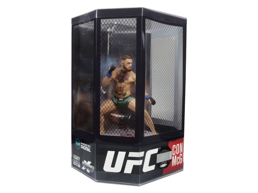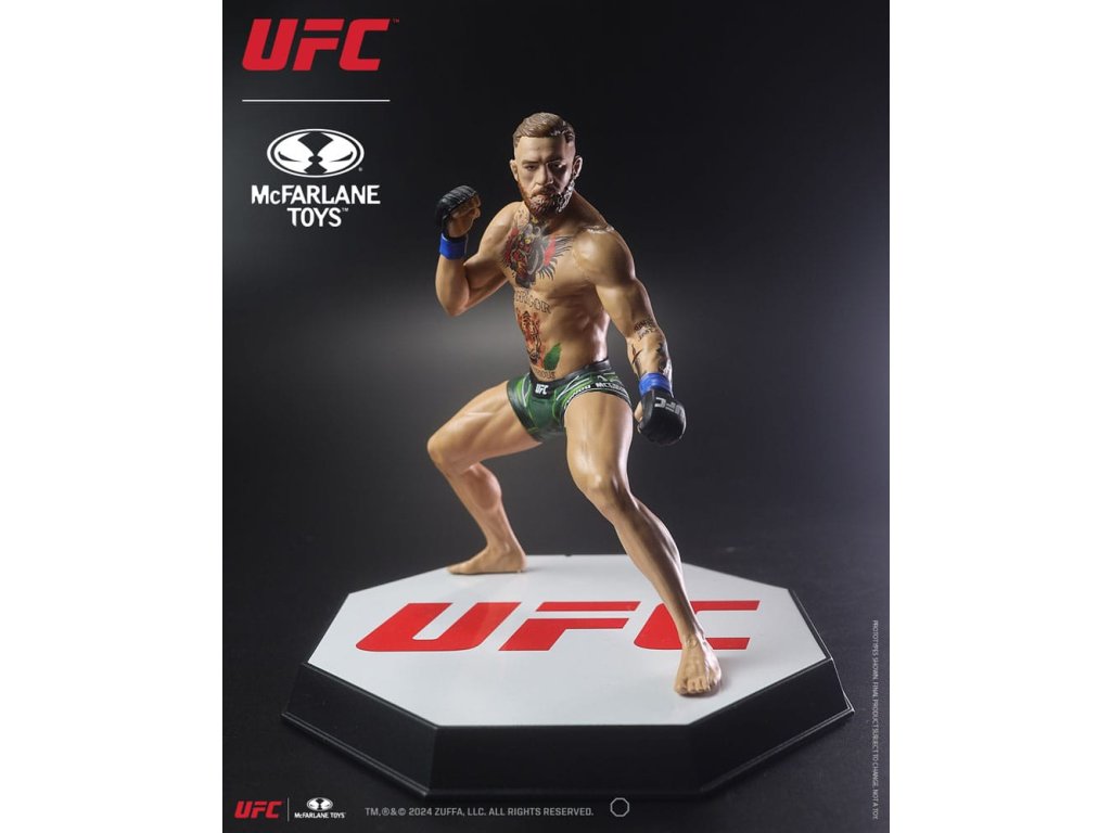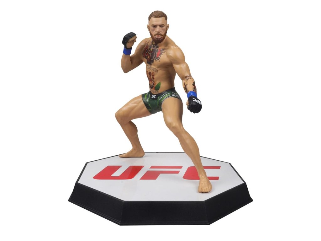 Figurka Conora McGregora (UFC) 18 cm. Po úspěšné rané kariéře v MMA debutoval Conor McGregor v UFC v roce 2013. McGregor je známý svými dovednostmi v protiútoku, přesnými údery a knockoutovou silou. Stal se prvním bojovníkem UFC, který zároveň držel mistrovské tituly UFC ve dvou váhových kategoriích, Péro a Lehká váha. Drží několik rekordů, včetně nejrychlejší výhry v zápase o mistrovský titul UFC, největšího počtu po sobě jdoucích ocenění Performance of the Night v historii UFC, Nejlepšího knockoutu v prvních 25 letech UFC a byl jmenován Bojovníkem roku 2015. McGregor se v roce 2017 dostal do seznamu 100 nejvlivnějších lidí časopisu Time, v roce 2021 byl magazínem Forbes označen za nejlépe placeného sportovce na světě a je považován za člověka, který zpopularizoval smíšená bojová umění a UFC po celém světě.