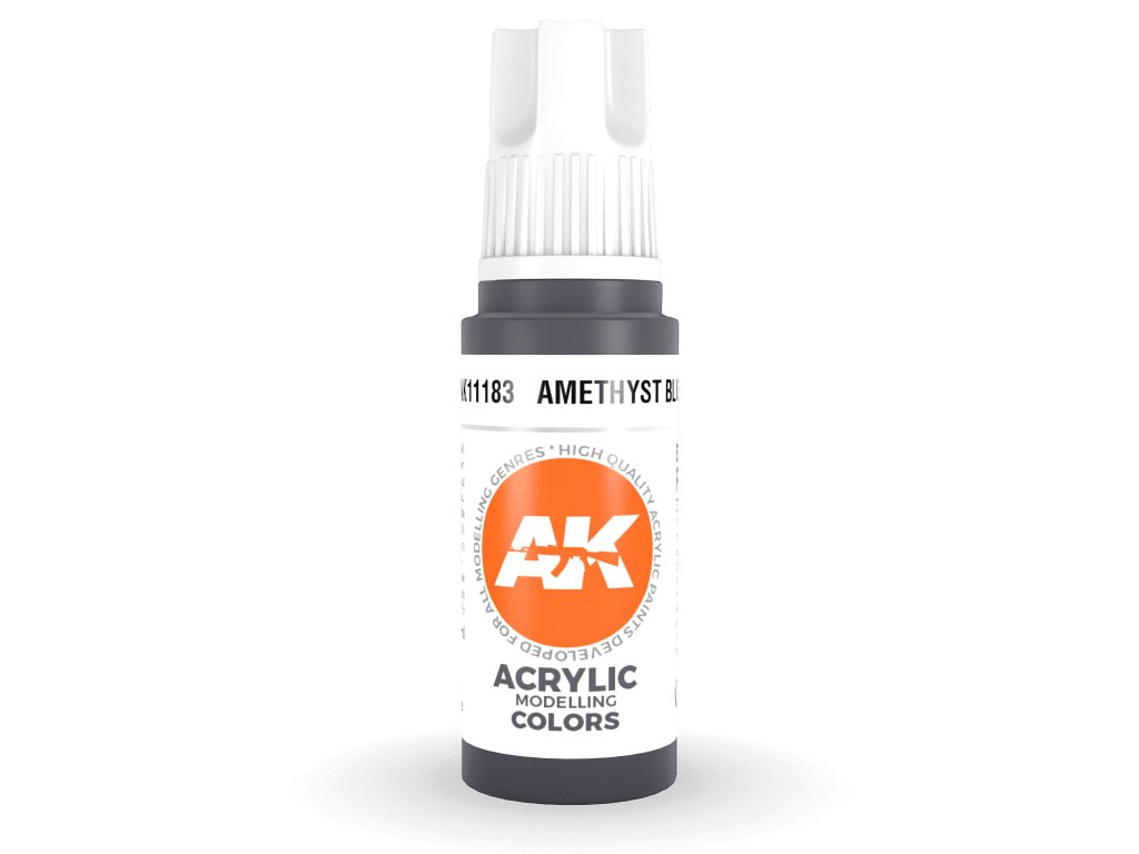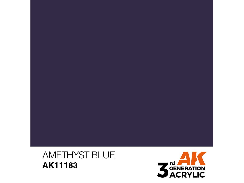 Akrylová barva Amethyst Blue od výrobce AK Interactive je vhodná pro nanášení štetcem i airbrushem. Akrylové modelářské barvy 3. generace (3Gen) jsou doposud nejpropracovanější recepturou akrylových barev. Barvy General Series mají vynikající krytí, úžasnou přilnavost a nové složení zabraňuje ucpávání trysky bez nutnosti barvy zdlouhavě rozmíchávat.Doplňkové parametry