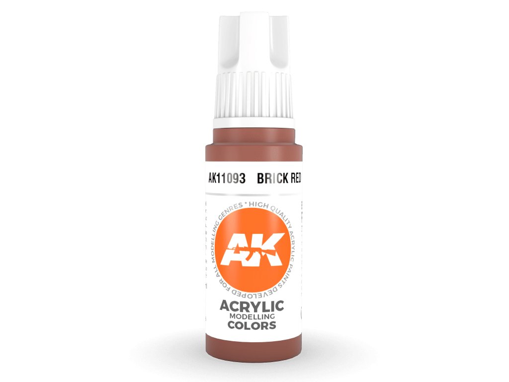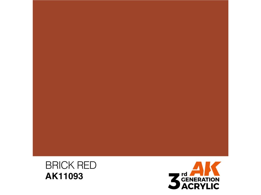 Akrylová barva Brick Red od výrobce AK Interactive je vhodná pro nanášení štetcem i airbrushem. Akrylové modelářské barvy 3. generace (3Gen) jsou doposud nejpropracovanější recepturou akrylových barev. Barvy General Series mají vynikající krytí, úžasnou přilnavost a nové složení zabraňuje ucpávání trysky bez nutnosti barvy zdlouhavě rozmíchávat.Doplňkové parametry