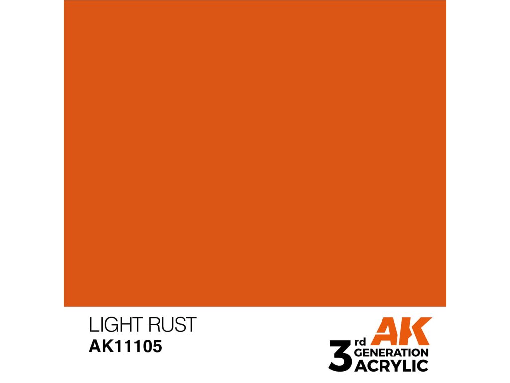 Akrylová barva Light Rust od výrobce AK Interactive je vhodná pro nanášení štetcem i airbrushem. Akrylové modelářské barvy 3. generace (3Gen) jsou doposud nejpropracovanější recepturou akrylových barev. Barvy General Series mají vynikající krytí, úžasnou přilnavost a nové složení zabraňuje ucpávání trysky bez nutnosti barvy zdlouhavě rozmíchávat.Doplňkové parametry