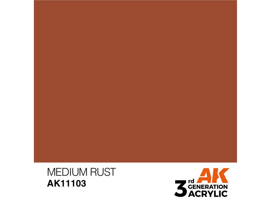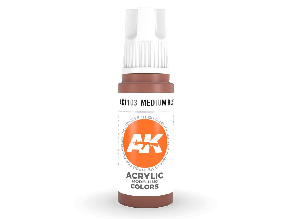 Akrylová barva Medium Rust od výrobce AK Interactive je vhodná pro nanášení štetcem i airbrushem. Akrylové modelářské barvy 3. generace (3Gen) jsou doposud nejpropracovanější recepturou akrylových barev. Barvy General Series mají vynikající krytí, úžasnou přilnavost a nové složení zabraňuje ucpávání trysky bez nutnosti barvy zdlouhavě rozmíchávat.Doplňkové parametry