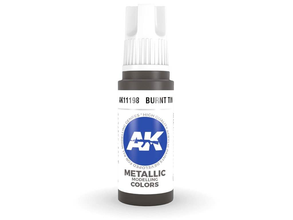 Akrylová barva Metallic Burnt Tin od výrobce AK Interactive je vhodná pro nanášení štetcem i airbrushem. Akrylové modelářské barvy 3. generace (3Gen) jsou doposud nejpropracovanější recepturou akrylových barev. Barvy General Series mají vynikající krytí, úžasnou přilnavost a nové složení zabraňuje ucpávání trysky bez nutnosti barvy zdlouhavě rozmíchávat.Doplňkové parametry