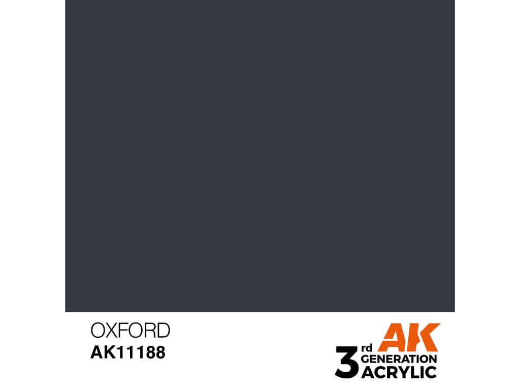 Akrylová barva Oxford od výrobce AK Interactive je vhodná pro nanášení štetcem i airbrushem. Akrylové modelářské barvy 3. generace (3Gen) jsou doposud nejpropracovanější recepturou akrylových barev. Barvy General Series mají vynikající krytí, úžasnou přilnavost a nové složení zabraňuje ucpávání trysky bez nutnosti barvy zdlouhavě rozmíchávat.Doplňkové parametry