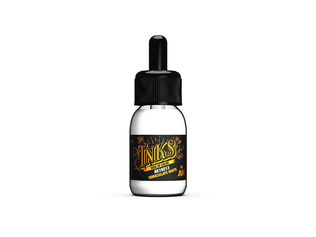 Prémiový Ink Inmaculate White od výrobce AK Interactive obsahuje vysoce kvalitní pigmenty, které zajišťují jedinečný lesk, sytost a živost barvy. Nové složení umožňuje dokonalou soudržnost pigmentů, zlepšuje odolnost a schnutí ve srovnání s jakýmikoli jinými Inky na trhu, lze je přidat do akrylových barev pro získání výraznějších odstínů. Barvy lze použít rovnou do airbrush pistole bez potřeby dalšího ředění. Skleněná lahvička je opatřena pipetou pro přesné dávkování barvy. Objem lahvičky je 30ml.Doplňkové parametry