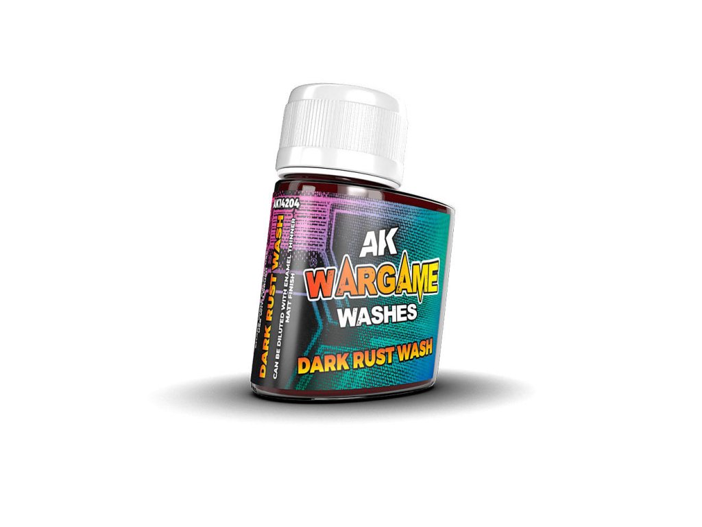 Vysoce kvalitní olejová barva Dark Rust Wash od výrobce AK Interactive je speciálně určená pro stínování větších ploch a miniatur. Olejové washe řady Wargame Series jsou určeny především pro zvýraznění textury a hloubky na větších plochách, právě zde uvítáte skvělou vlastnost olejových barev a to delší dobu schnutí, nemusíte se tedy bát zasychání barvy už při nanášení a vzniku fleků. S barvou se dá pracovat i hodiny po jejím nanesení, stačí na štětec nanést AK Interactive: Odorless Thinner a barvu dle libosti setřít či jinak upravit. Tyto barvy se také daleko lépe dostávají do opravdu tenkých detailů modelů, jelikož jsou daleko řidší než klasické akrylové washe. Olejové barvy vždy nanášejte až na zalakovaný model. Pro vymytí barvy ze štětců nepoužívejte klasickou vodu ale AK Interactive: Odorless Thinner nebo AK Interactive: White Spirit.