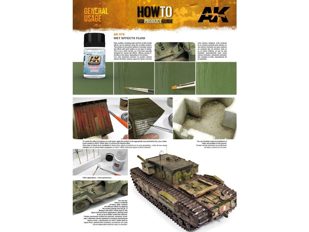 Wet Effects Fluid je enamelový přípravek od výrobce AK Interactive, který slouží k dosažení realistických efektů deště, kaluží nebo stékající vody. Nejedná se o lesklý lak, tento přípravek byl speciálně navržen pro použití, které nabízí různé stupně intenzity jasu v závislosti na povrchu.Doplňkové parametry