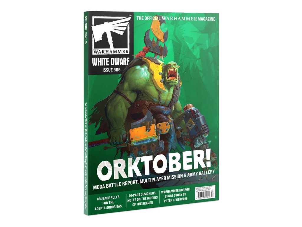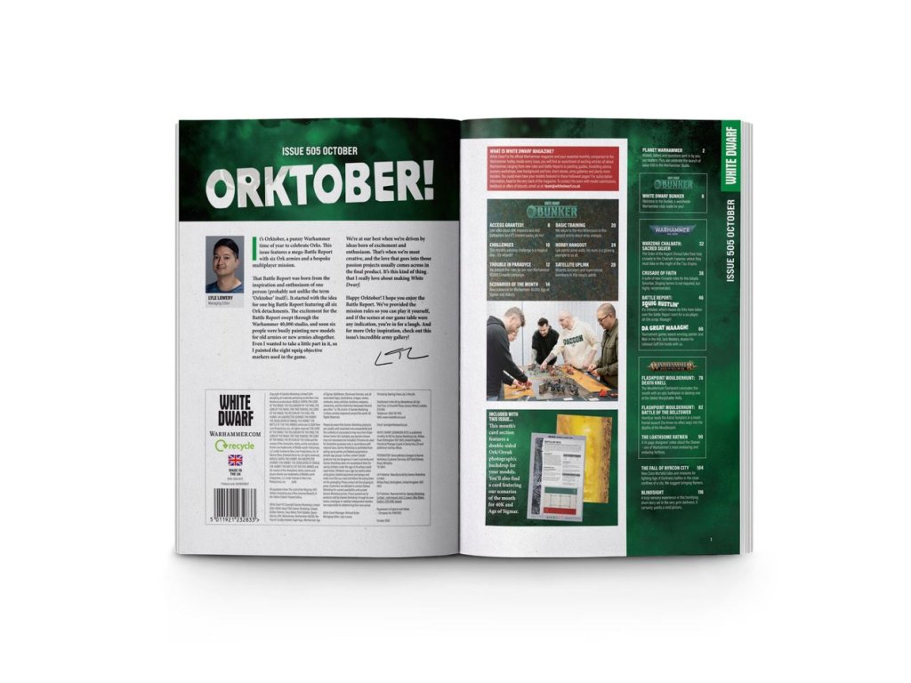 Ke každému výtisku White Dwarf 505 je navíc přiložena kartonová vložka, která obsahuje oboustranné fotografické pozadí s orkskou/orruckou tematikou, ideální pro fotografování vašich zelenáčů, a také oboustrannou kartu scénářů měsíce White Dwarf Bunker.