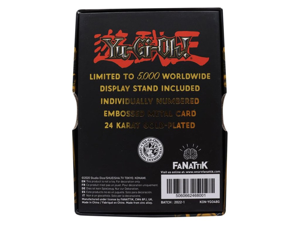 Limitováno 5 000 kusy po celém světě, oboustranně reliéfní, individuálně číslovaná, vysoce detailní kovová karta pozlacená 24karátovým zlatem. Dodáváno v prezentační krabičce se stojánkem.
